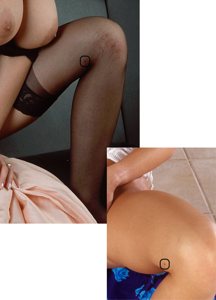 When not Photoshopped away, this very large pronounced freckle on the inner thigh just above the left knee made it easy to tell orientation if her legs were in the photo even if taken from a distance.