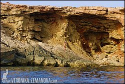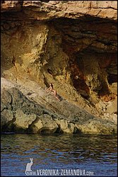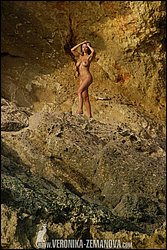For this set Veronika had to make her perilous way to the scenic rocks on which she’s posing. This meant rowing over from the sailboat she had been on and then, because it was impossible to get any closer on the rowboat, swimming over to the rocks. Adding further difficulty were the sea-urchins that were all over the rocks, making bare-footed Veronika nervous every step she took!